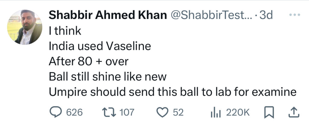 ” මම හිතන්නෙ ඉන්දියාව වැස්ලීන් භාවිතා කළා. පන්දුවාර 80 න් පස්සෙත් පන්දුව දිලිසුණේ අලුත් එකක් වගේ. විනිසුරුවරුන් මෙම පන්දුව පරීක්ශණයක් සඳහා යොමුකළ යුතුයි. “